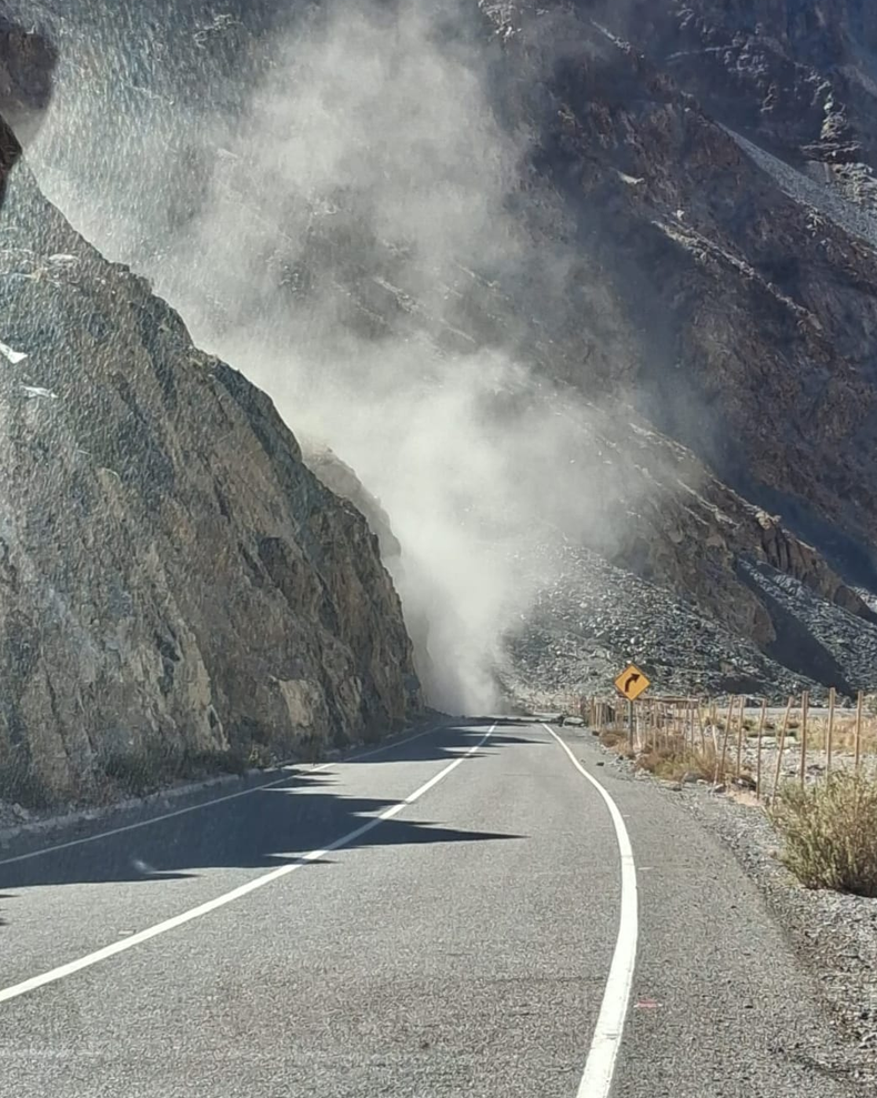 Vialidad Nacional difundió imágenes que dan cuenta de un impactante desmoronamiento de rocas sobre la calzada en la Ruta 41, específicamente en el sector chileno y en las inmediaciones del embalse Puclaro. Las capturas muestran piedras de diversos tamaños obstruyendo parte del camino, mientras vehículos de pequeño y gran porte transitaban por la zona en el momento del siniestro.