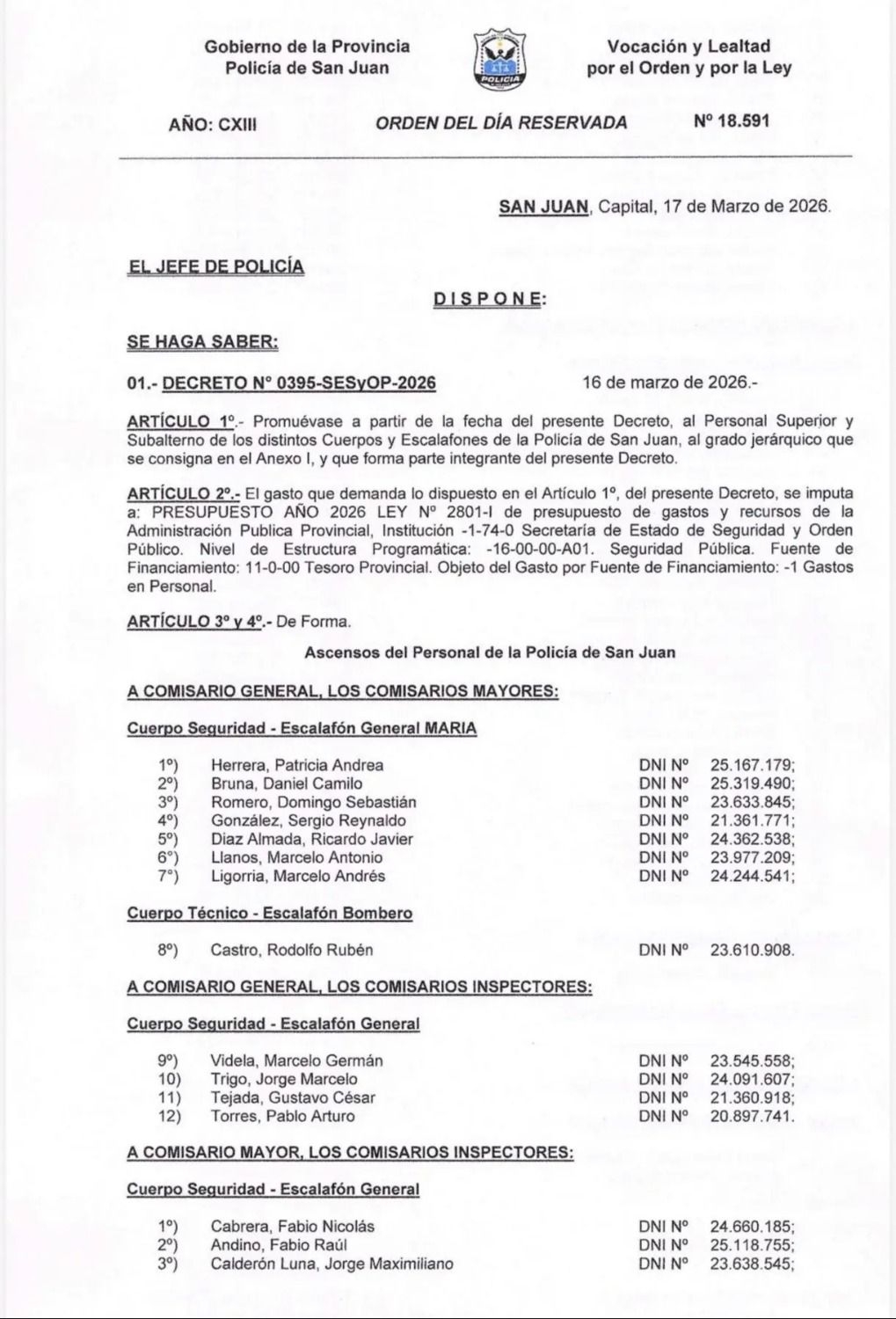 Por esto es que en el decreto también figura el ascenso a comisario general Jorge Marcelo Trigo, Gustavo César Tejada y Pablo Arturo Torres. A su vez, los flamantes comisarios mayores son Patricia Andrea Herrera, Daniel Camilo Bruna, Domingo Sebastián Romero, Sergio Reynaldo González, Ricardo Javier Díaz Almada, Marcelo Antonio Llanos y Marcelo Andrés Ligorria. Mientras que, en el cuerpo de bomberos, se promocionó a Rodolfo Rubén Castro.