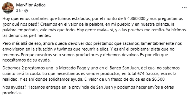 El caso se volvió público tras un extenso mensaje que Guerra compartió en sus redes sociales, donde describió la difícil situación económica que enfrenta junto a su familia y su emprendimiento “Mar-Flor”. "Hoy queremos contarles que fuimos estafados por un total de $4.380.000", afirmó este viernes. En la misma publicación, expresó su desconcierto: "Creemos en el valor de la palabra, en mi pueblo y en nuestra crianza, y sabemos que la palabra empeñada vale más que cualquier cosa. Hay personas malintencionadas... sí, y los hechos lo demuestran".